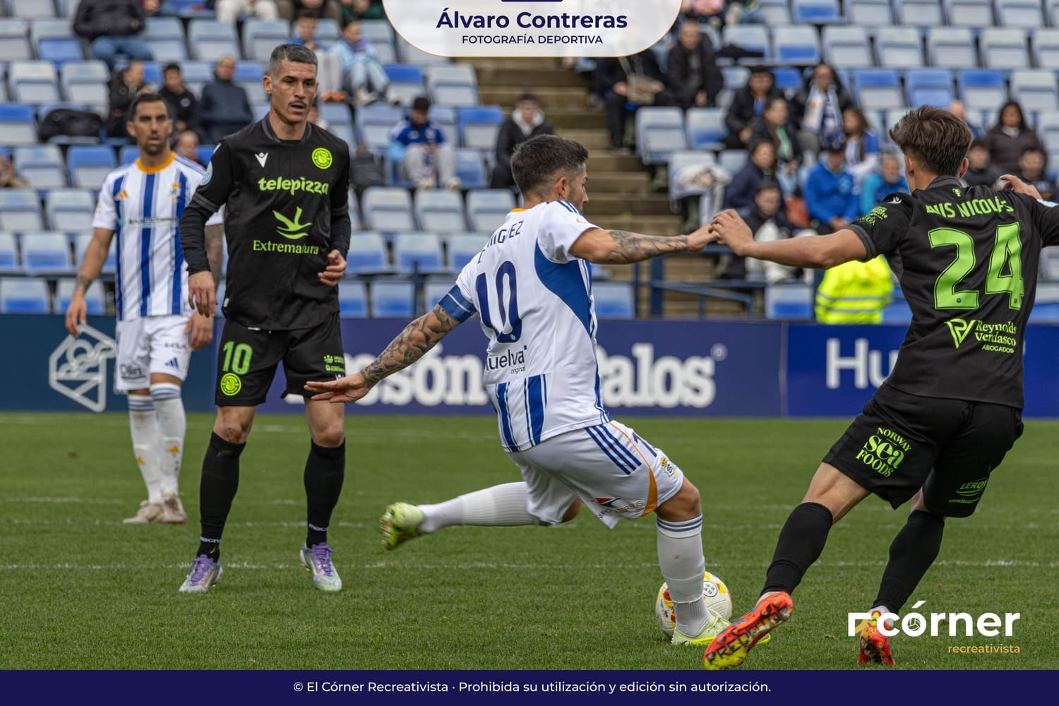 El Recreativo de Huelva firmó una gran victoria ante el CD Extremadura (3-1) en un partido intenso, cargado de emoción y buen fútbol con goles de Pepe Mena, Antonio Domínguez y Caye Quintana.