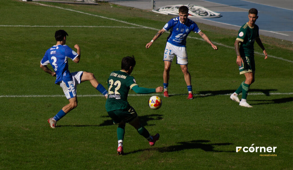 Los mejores minutos del Recre llegaron antes del descanso: Paolo subió por banda derecha, forzando un córner y en la jugada posterior apareció la parada del partido: Bloch voló para despejar una volea de Alberto López que iba con música. El Decano se acercaba al gol y cerraría el primer tiempo con un nuevo lanzamiento a portería por parte de Mena.